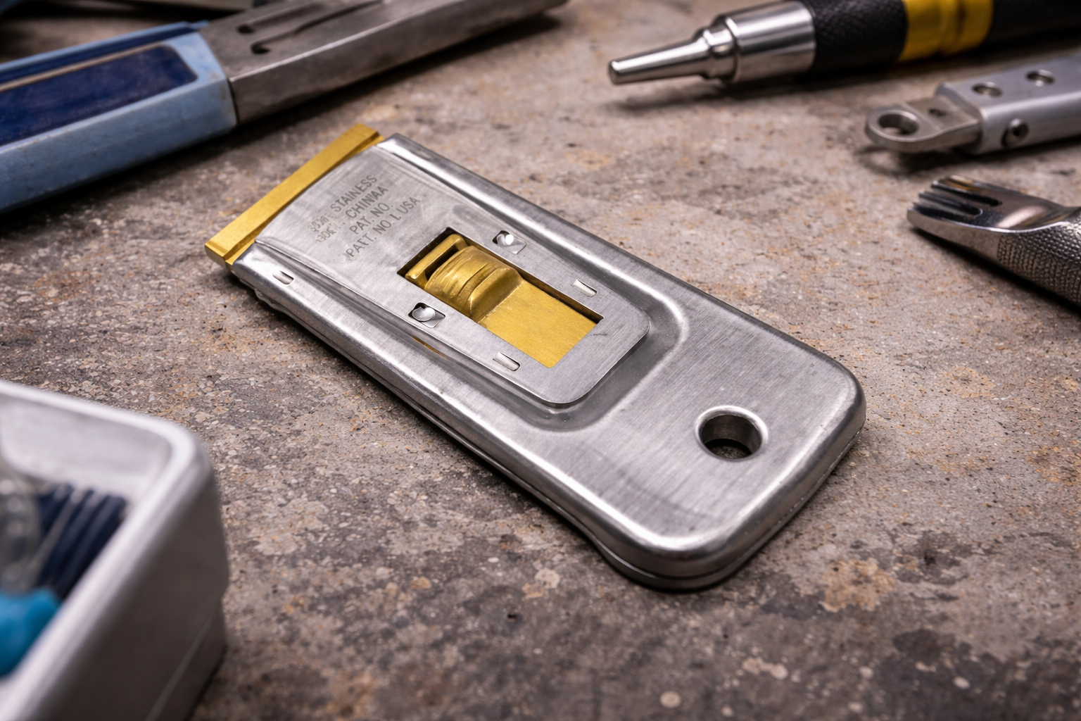 Ce modèle complet inclut une lame protégée par un système sécurisé, permettant de prévenir les risques de coupure et de prolonger la durée de vie du grattoir.